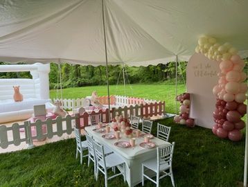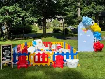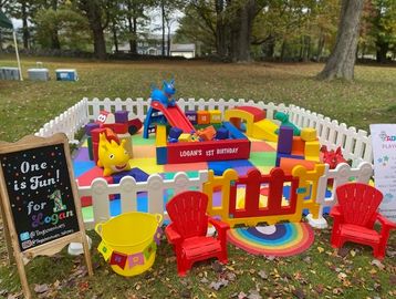 ALL INCLUSIVE! 12x12 custom Soft play, bounce house, kids table/8 chairs, 8ft balloon garland with decal'd backdrop to match your theme/color scheme. Free delivery under 30 miles