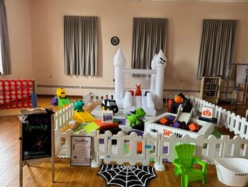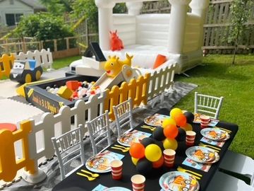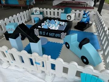 12x12 soft play, 8x8 bounce house (your choice of color) 1 kids decorate table including 8 chairs. All in your color scheme/theme.