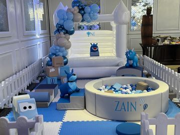 12x12 custom Soft play, 8x8 bounce house, 10ft balloon garland on bounce house, all to match your theme/color scheme. Delivery fee may apply